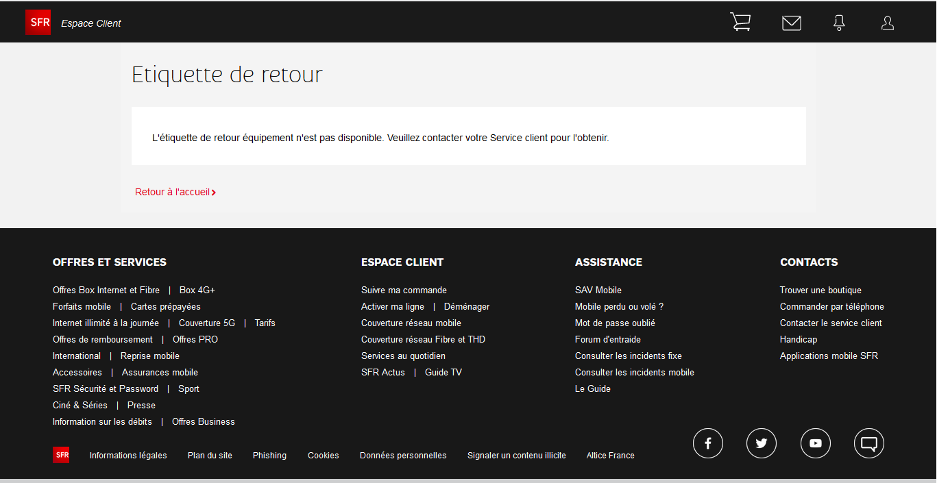 Nous navons pas accès à votre compte client. Attention Létiquette retour SFR est disponible sur votre Espace client pendant un mois à partir de votre demande de résiliation ou de changement doffre. Vous avez alors 15 jours pour nous le restituer après la date de résiliation effective.
